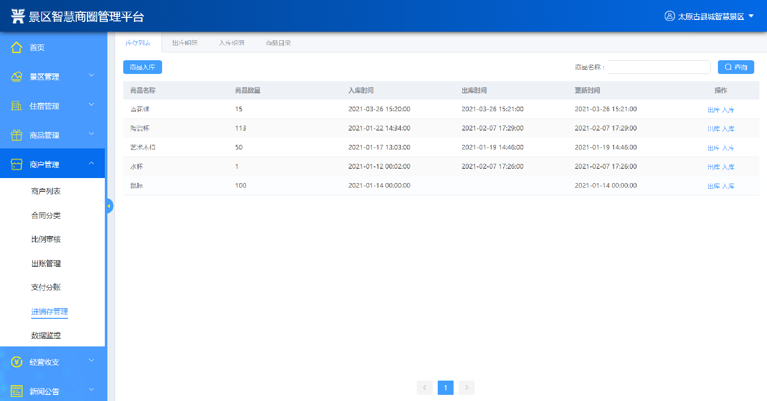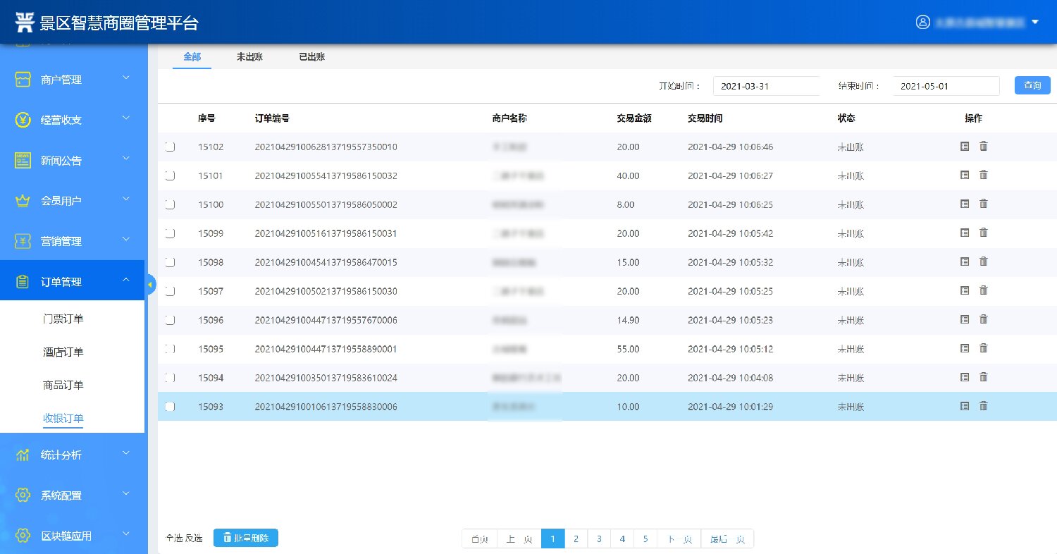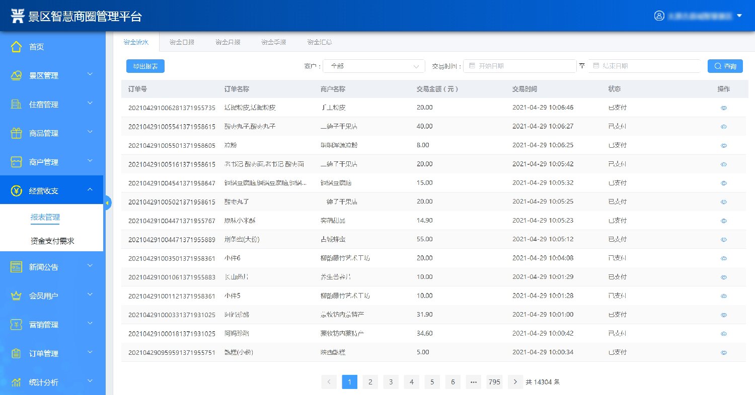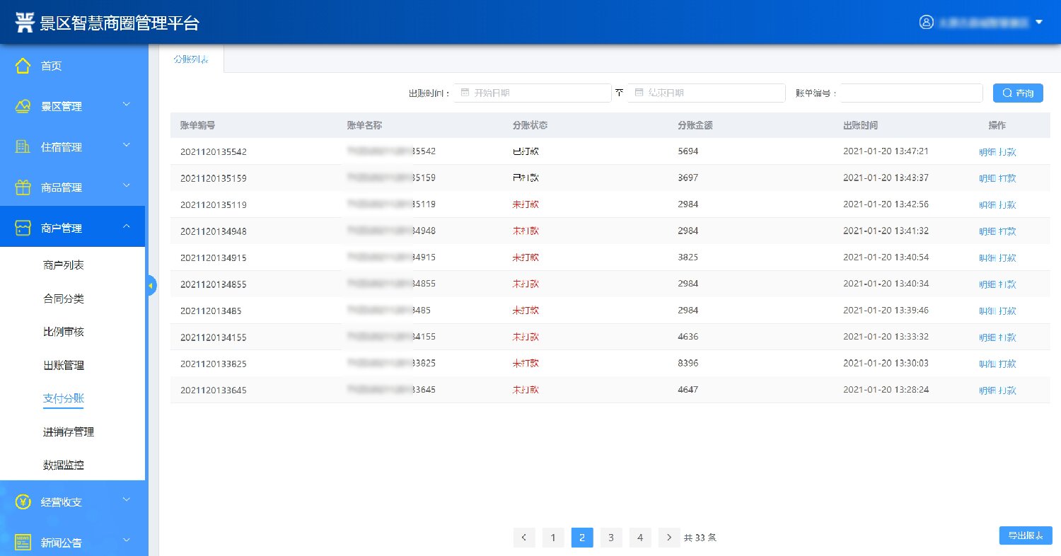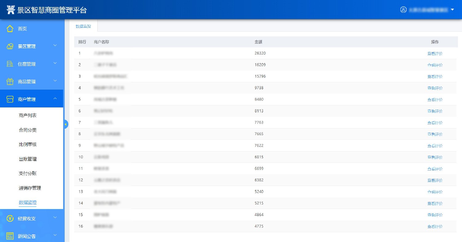 2.經營商戶管理:系統后臺維護管理景區內的經營商戶,維護商戶的名稱、聯系手機、詳細地址等信息。能夠對商戶合同進行分類管理,對于租金收取等做到到期前自動提醒;具備營銷管理功能,折扣管理功能,能夠體現預收款、以及預收款轉收入的情況;統一采購下需實現進、銷、存動態管理功能;通過大數據監控分析,對商戶進行免租金,末位淘汰機制,同時對商戶進行評價及分析。