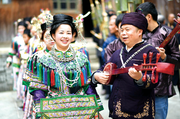 △ 2018年1月17日,在貴州榕江縣寨蒿鎮扒王村宰管侗寨,侗族群眾身穿盛裝參加侗年踩歌堂活動。王炳真攝