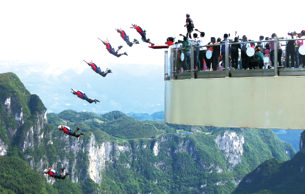 △ 2018年4月27日,中國(重慶·云陽)第二屆世界低空跳傘大賽在重慶云陽龍缸景區舉行,來自美國、加拿大、澳大利亞、委內瑞拉、智利等國家的16位世界頂級低空跳傘選手,以極其精湛的低空跳傘技藝挑戰世界第一懸挑玻璃廊橋——云端廊橋。劉興敏攝