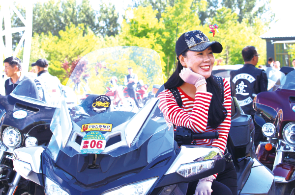 △ 2018年8月5日,“漫游之旅”——2018(通遼)第三屆科爾沁500公里風景大道自駕游活動啟動,圖為游客在機車上拍照留念。陳鳳攝