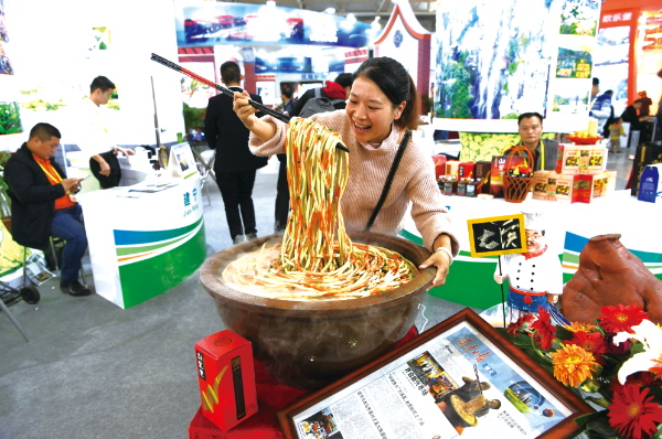 △ 2018年11月30日,第四屆“海上絲綢之路”(福州)國際旅游節在福州海峽國際會展中心開幕,參觀者被福建尤溪大條面模型吸引。王東明攝