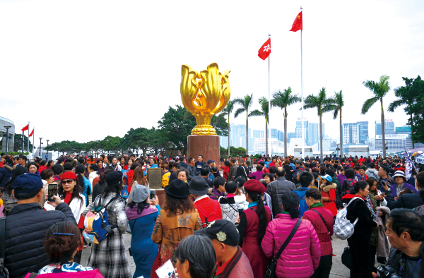 △ 2018年12月13日,經過一個月的維修,位于香港金紫荊廣場的金紫荊雕塑重新亮相,吸引眾多內地游客“打卡”拍照。張煒攝