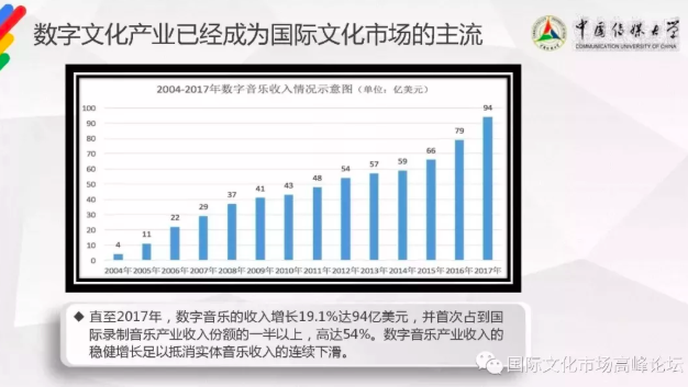 《國際文化市場(chǎng)報(bào)告2018》顯示,實(shí)體音樂產(chǎn)業(yè)總收入自1999年開始幾乎是一路下滑,2010年跌破三位數(shù),2017年已跌至52億美元,由市場(chǎng)占比100%下滑為占比僅30%。直至2017年,數(shù)字音樂的收入增長19.1%達(dá)94億美元,并首次占到國際錄制音樂產(chǎn)業(yè)收入份額的一半以上,高達(dá)54%。數(shù)字音樂產(chǎn)業(yè)收入的穩(wěn)健增長足以抵消實(shí)體音樂收入的連續(xù)下滑。