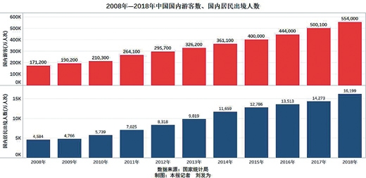 十年間,我們?cè)诼猛局械臅r(shí)間越來(lái)越多,也有越來(lái)越多的人踏上旅途。據(jù)國(guó)家統(tǒng)計(jì)局?jǐn)?shù)據(jù)顯示,2018年中國(guó)國(guó)內(nèi)游客出游55.4億人次,這一數(shù)據(jù)是2008年17.1億人次的3倍還要多;2018年中國(guó)居民出境人數(shù)達(dá)1.62億人次,而在2008年只有4584萬(wàn)人次。