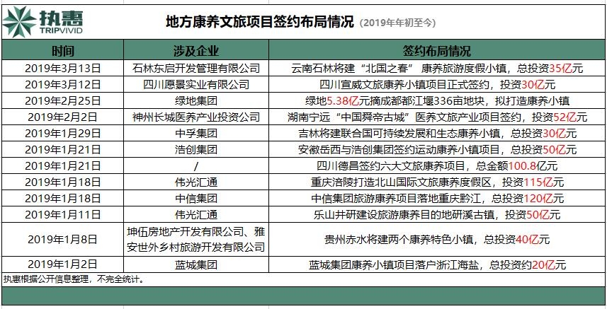 與此同時,地方多個省市康養(yǎng)文旅項目簽約正在提速。執(zhí)惠統(tǒng)計的信息顯示,2019年年初以來,重慶、云南、四川、湖南、安徽、浙江等地陸續(xù)簽約布局康養(yǎng)類旅游小鎮(zhèn)項目,數(shù)量高達(dá)12起,總簽約金額近650億元,包括綠地集團(tuán)、藍(lán)城集團(tuán)、中信集團(tuán)等企業(yè)。其中金額最大的要屬中信集團(tuán)簽約的三塘蓋國際旅游康養(yǎng)度假區(qū)項目。今年1月,重慶黔江區(qū)政府與中信集團(tuán)全資子公司——中信正業(yè)簽約三塘蓋國際旅游康養(yǎng)度假區(qū)項目,總投資達(dá)120億元,規(guī)劃區(qū)面積29平方公里。