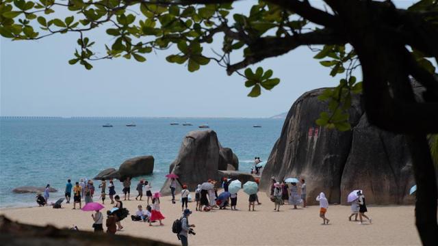 在海南省三亞市天涯海角旅游景區,游客在參觀游覽(4月13日攝)。新華社記者 李夢嬌 攝