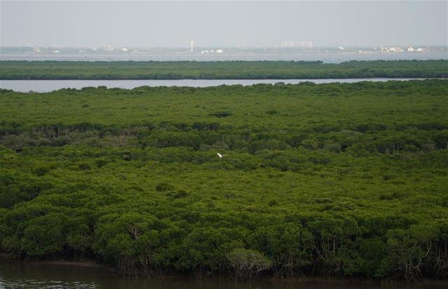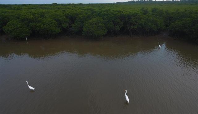 在海南東寨港國家級自然保護區,白鷺在保護區紅樹林附近休憩(4月10日無人機拍攝)。 新華社記者 楊冠宇 攝