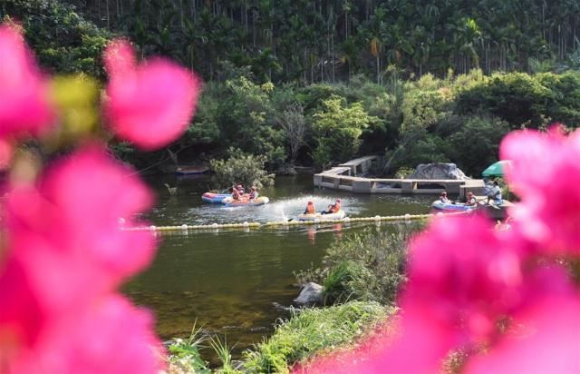 游客在海南省瓊中黎族苗族自治縣瓊中峽體驗漂流(4月11日攝)。新華社記者 賀燦鈴 攝