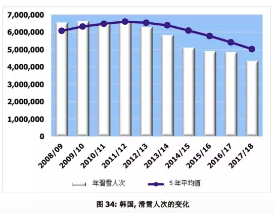 報告認為,韓國滑雪產業(yè)停滯的原因可能更多的還是與國內乃至整個亞洲的經濟狀況和低迷的市場有關。而考慮到過去 5 年滑雪人次的平均值, 恐怕這種下降趨勢還要持續(xù)幾年。所以,滑雪市場的發(fā)展和復蘇不能僅寄托于冬奧這樣的賽事來推動和“拯救”。