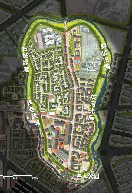 以環(huán)狀的古城墻為界線,在城內(nèi)包含了東安之心、上城局、文廟、風(fēng)尚里、城隍廟五大重點(diǎn)建筑群;城環(huán)上,則有夢(mèng)回西園、新登綠廊、耕讀田園、城河光廊、名人公園五大游園;而在古城外,則以直接市、塔山居、藝術(shù)糧倉(cāng)、創(chuàng)客公社、民俗工坊五類重點(diǎn)產(chǎn)品為主,承載著商業(yè)、居住、教育、文創(chuàng)、民俗等功能。