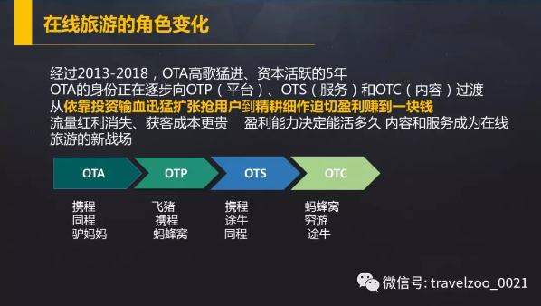 在線旅游已經(jīng)從單純OTA(代理)到OTP(平臺)到OTC(內容)到OTS(服務)多種模式并存和角色的遷移,只做賣貨渠道的公司,已經(jīng)沒有持續(xù)生存的空間。