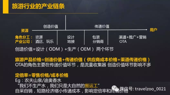 我們今天看到的旅游供應商、資源商其實是在創(chuàng)造價值環(huán)節(jié),而OTA、線下門店、旅游分銷商、對產(chǎn)品的推廣、宣傳都是在傳遞價值環(huán)節(jié)。