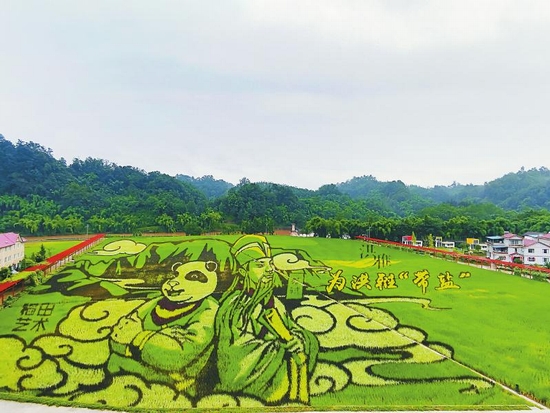 8月1日,洪雅縣東岳鎮橋口村的120畝巨型稻田畫,蘇東坡與大熊貓成為“主角”。