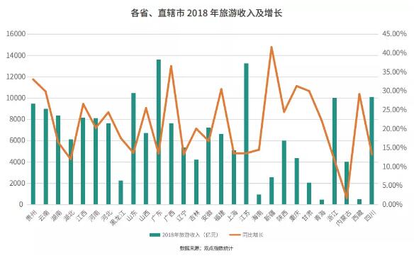 但另一方面,中西部地區(qū)省份在旅游總收入增長方面卻遠超過東部地區(qū)。統(tǒng)計數(shù)據(jù)顯示,2018年,在旅游總收入增長排名前十的省、直轄市上,80%集中在了中西部地區(qū)。當(dāng)中,中、西部旅游收入增長率分別為25.79%、27.69%,遠超過東部地區(qū)的9.63%;此外,中、西部旅游人次增長分別為18.62%、22.65%,而東部地區(qū)僅為3.55%。