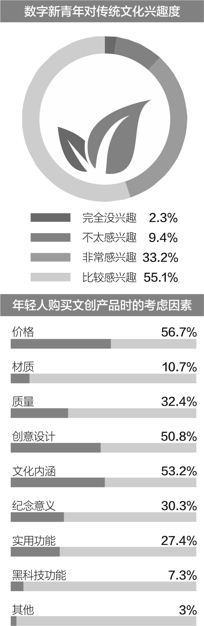 不過(guò),當(dāng)下很多年輕人雖然愿意“為愛(ài)買(mǎi)單”、為傳統(tǒng)文化貢獻(xiàn)購(gòu)買(mǎi)力,但在文創(chuàng)產(chǎn)品購(gòu)買(mǎi)上,年輕人更加注重產(chǎn)品的文化內(nèi)涵、創(chuàng)意設(shè)計(jì)和實(shí)用性。數(shù)據(jù)顯示,56.7%的數(shù)字新青年們最看重的是價(jià)格因素。