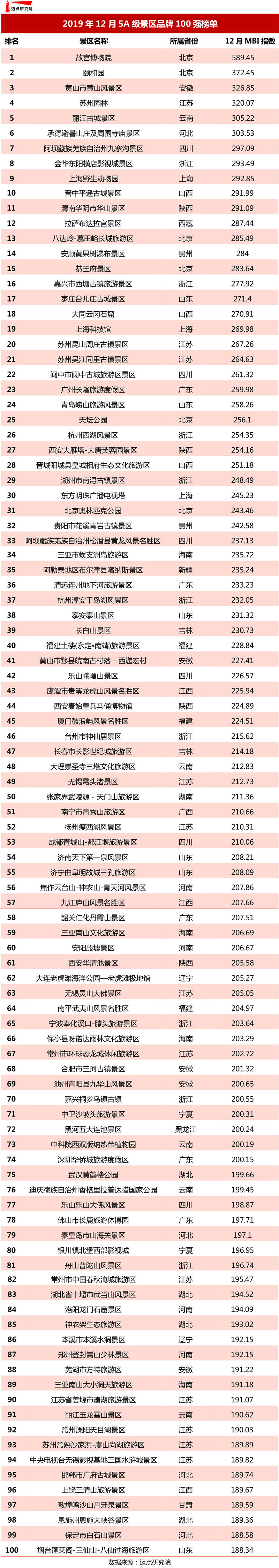 “2019年12月5A級景區品牌100強榜單”數據來源于邁點品牌指數MBI,根據12月邁點品牌指數MBI的258個5A景區數據匯總統計而成。具體說明如下: