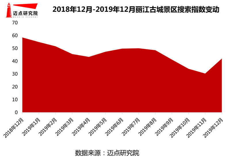 在反映潛在用戶關注的搜索指數上,本月麗江古城景區表現較為突出。經邁點研究院數據監測,12月麗江古城景區搜索指數高達42.04,環比增長38.47%,這表明旅游市場中關注該景區的潛在客群逐漸增多。