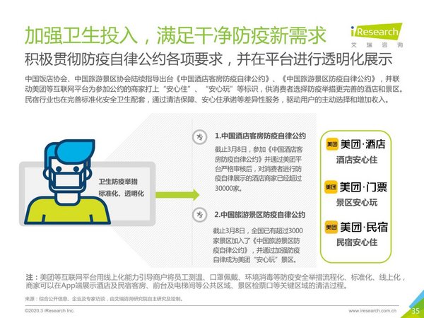 與此同時(shí),中國(guó)酒店旅游業(yè)的高在線(xiàn)化率也讓產(chǎn)業(yè)鏈各方的協(xié)同效率大增。據(jù)艾瑞觀察,在行業(yè)協(xié)會(huì)及OTA的共同推動(dòng)下,行業(yè)各方聯(lián)合主動(dòng)變革。譬如,中國(guó)飯店協(xié)會(huì)、全國(guó)綠色飯店工作委員會(huì)、美團(tuán)聯(lián)合發(fā)布《中國(guó)酒店客房防疫自律公約》;中國(guó)旅游景區(qū)協(xié)會(huì)指導(dǎo)下,美團(tuán)及多家景區(qū)聯(lián)合發(fā)布《中國(guó)旅游景區(qū)防疫自律公約》,帶動(dòng)了參與酒店、景區(qū)的衛(wèi)生服務(wù)標(biāo)準(zhǔn)化、衛(wèi)生防疫信息線(xiàn)上化,滿(mǎn)足了用戶(hù)的安全需求。