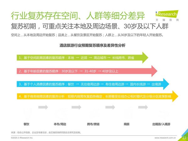 隨著國(guó)內(nèi)疫情形勢(shì)的好轉(zhuǎn),因疫情而受到壓制的消費(fèi)信心也逐漸恢復(fù)。根據(jù)艾瑞的用戶(hù)研究,餐飲需求或率先回暖,商務(wù)出差、國(guó)內(nèi)游、出境游逐級(jí)恢復(fù)。