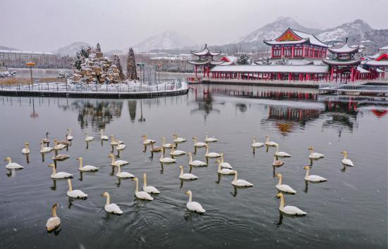 位于榮成市區的櫻花湖是大天鵝的重要棲息點,現在每天有500多只大天鵝游弋,是名副其實的市區“天鵝湖”。