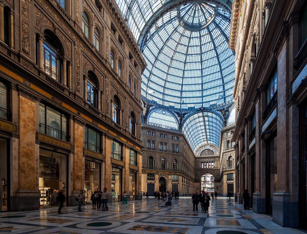冬日的暖陽(yáng)下,地中海的海風(fēng)穿過(guò)意大利那不勒斯王宮廣場(chǎng),吹進(jìn)翁貝托一世長(zhǎng)廊。長(zhǎng)廊外部設(shè)有4個(gè)巨大的入口拱門(mén),內(nèi)部?jī)蓷l步行街呈十字形交叉。透過(guò)泛著蔚藍(lán)色的玻璃穹頂,陽(yáng)光灑進(jìn)步行街。始建于1887年的翁貝托一世長(zhǎng)廊,是意大利最具代表性的商業(yè)步行街之一。