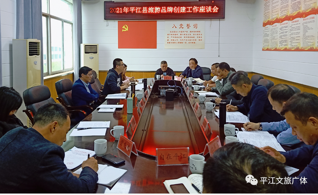 3月31日下午,平江縣文旅廣體局主持召開“2021年平江縣旅游品牌創建工作”座談會。玻璃橋景區石牛寨、天岳幕阜山、紅軍營、長壽秘境景區、連云山大峽谷、碧龍峽景區、紅蓮兵寨、平江縣山潤山茶油、平江縣玉峰熟食基地、盤石洲生態園、自在平江野奢度假酒店等十一個企業負責人參與會議。