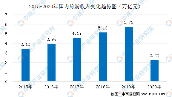 旅游收入數(shù)由2015年的3.42萬億元增至2019年的5.73萬億元。2020年國內(nèi)旅游收入2.23萬億元,比上年同期減少3.50萬億元,下降61.1%。其中,城鎮(zhèn)居民出游花費1.80萬億元,下降62.2%;農(nóng)村居民出游花費0.43萬億元,下降55.7%。據(jù)中國旅游研究院發(fā)布的《2021年第一季度旅游經(jīng)濟運行分析與上半年趨勢預(yù)測》,國內(nèi)旅游收入0.56萬億元,同比增長150%。