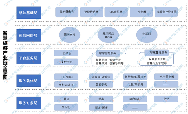 智慧旅游產(chǎn)業(yè)鏈所涉及的環(huán)節(jié)復(fù)雜、行業(yè)眾多,大大超出了傳統(tǒng)旅游行業(yè)的范疇。從結(jié)構(gòu)來看,智慧旅游產(chǎn)業(yè)鏈中既有水平供需關(guān)系,也存在垂直協(xié)作關(guān)系。同時,隨著技術(shù)的不斷提升、需求更新,持續(xù)不斷有新的企業(yè)進入產(chǎn)業(yè)鏈。中商產(chǎn)業(yè)研究院整理了我國智慧旅游產(chǎn)業(yè)鏈圖主要包括:感知基礎(chǔ)層、通信網(wǎng)絡(luò)層、平臺服務(wù)層、服務(wù)載體層以及服務(wù)對象層五大層面,如下圖所示: