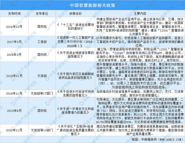 國家重視智慧旅游產(chǎn)業(yè)發(fā)展,出臺了《“十三五”旅游業(yè)發(fā)展規(guī)劃的通知》、《國務(wù)院辦公廳關(guān)于促進全域旅游發(fā)展的指導(dǎo)意見》、《國務(wù)院辦公廳關(guān)于進一步激發(fā)文化和旅游消費潛力的意見》《關(guān)于深化“互聯(lián)網(wǎng) 旅游”推動旅游業(yè)高質(zhì)量發(fā)展的意見》等政策,鼓勵和引導(dǎo)智慧旅游產(chǎn)業(yè)發(fā)展。