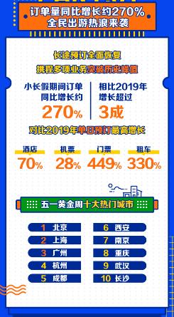 今年五一連休五天,消費(fèi)者積蓄已久的長(zhǎng)途出行需求得以釋放。來(lái)自攜程方面數(shù)據(jù)顯示,攜程五一假期總訂單量同比增長(zhǎng)約270%,對(duì)比2019年同期增幅超過(guò)30%。酒店、門(mén)票、租車(chē)、機(jī)票四項(xiàng)業(yè)務(wù)單日訂單量最高增幅分別為:70%、449%、330%、28%。