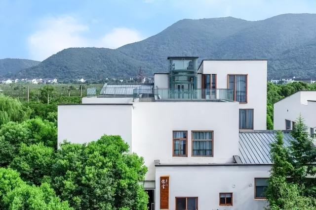 順著宋秋燕手指的方向看去,一棟白色建筑映入眼簾,這是一棟新建的民宿。這處藏在村莊里的別墅被田野、河流、竹林環繞著。走進民宿,登上2米高的觀景臺,月獅村IP——“葫蘆”的形象若隱若現,樓前的一片田野讓久居城市的游客身心放松。