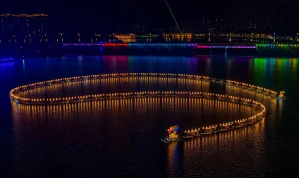 2025年9月14日晚,在第三屆張家界旅游發展大會前夕,慈利縣放馬洲公園的澧水河畔上演了一場“活態非遺+科技光影”的盛宴。那條長達500米、由66根竹筏串聯而成的板板龍燈,結合燈光秀、無人機表演和水幕等現代科技元素,打造出“水陸空”三維沉浸式夜游體驗。
